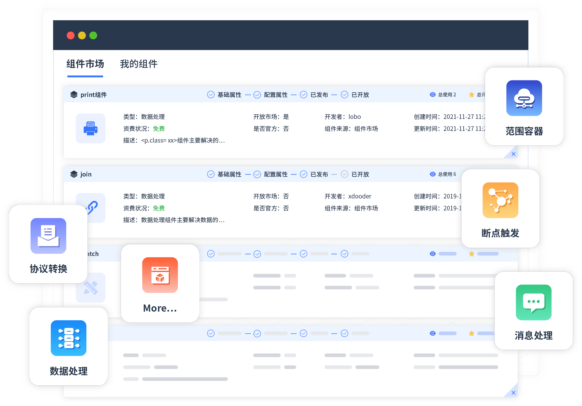 针对集成场景,,,圆梦钱包提供组件市场,,,例如协议转换、、、、消息处理、、、、文件操作等。。。除平台提供的组件外,,,客户可以自定义所需组件。。。。