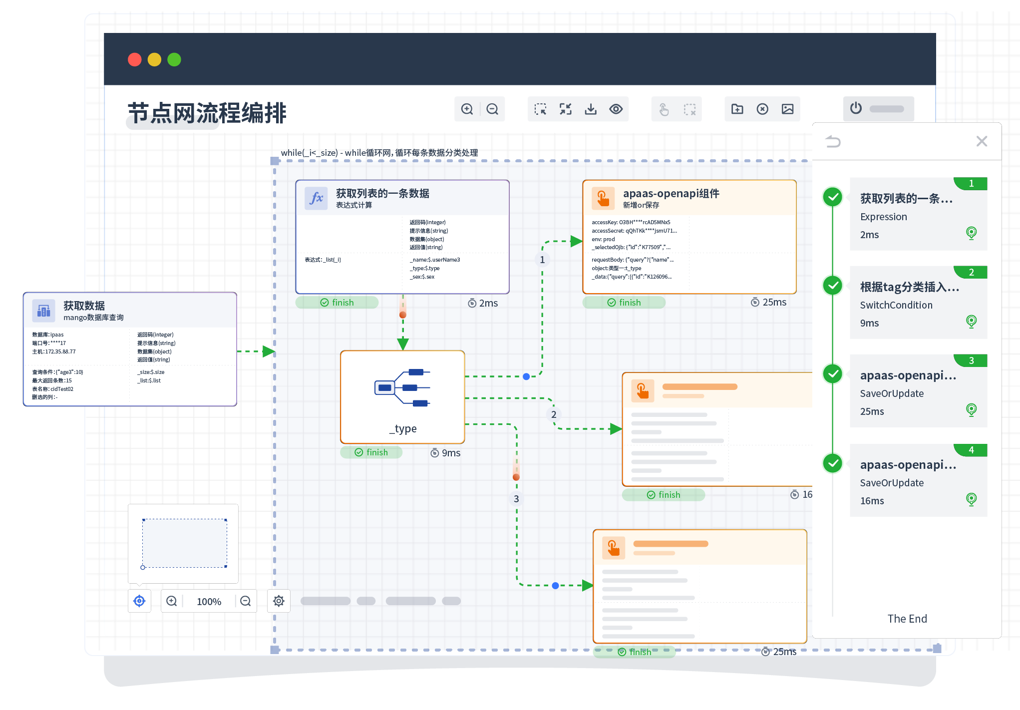 针对集成场景,,组件定义后支持进行流程编制,,,,不同于传统代码方式,,,,通过图形化展示,,,支持在线调试、、、、日志查看和运行回放。。。。