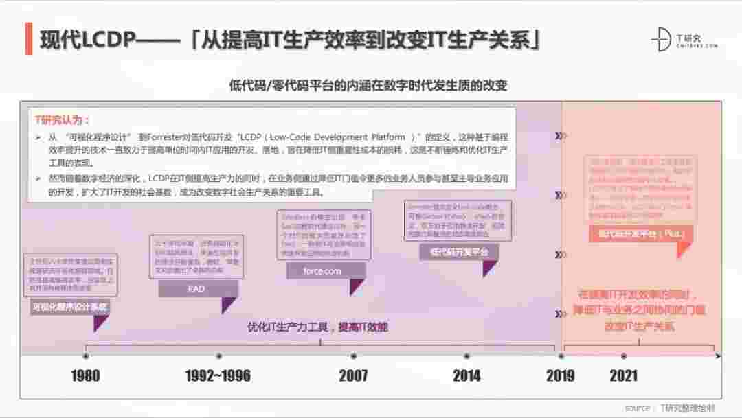 2020年前后,,,源于提高IT工作者开发效能的LCDP不断进化和衍生,,面对业务导向日益明显的数字化变革。。LCDP衍生出了面向不同对象的升级服务——面向专业人群的LCDP和业务人群的NCDP,,,LCDP与NCDP的不同服务属性被逐渐认可和接受。。 LCDP在提高IT开发效率的同时,,,降低IT与业务之间协同的门槛改变IT生产关系。。。。