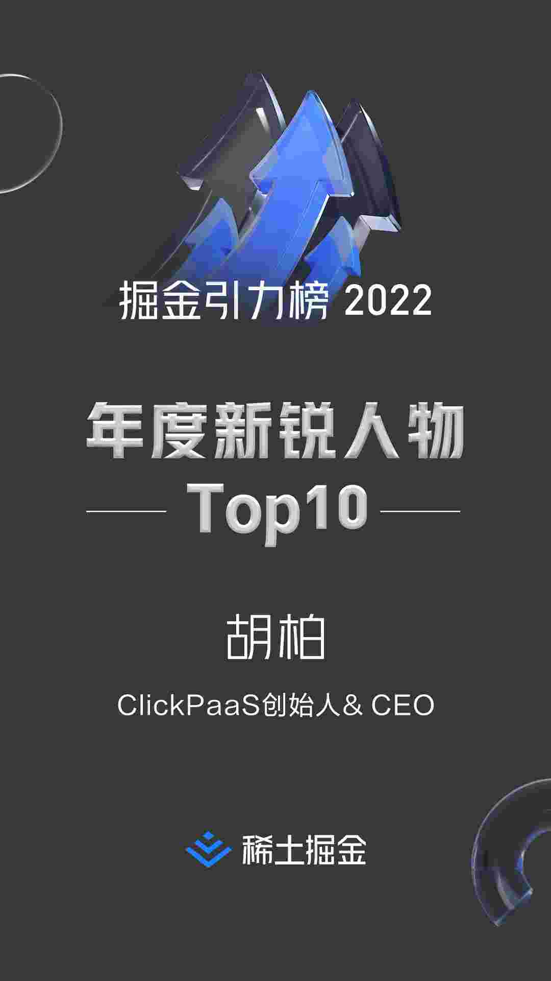 2022年1月6日,,,稀土掘金社区第一届「掘金未来大会」成功举办,,,会上发布了“2022 稀土掘金引力榜 年度新锐人物”榜单,,上海爱湃斯科技有限公司(简称圆梦钱包)创始人及CEO胡柏实力入选年度新锐人物TOP 10。。。。
